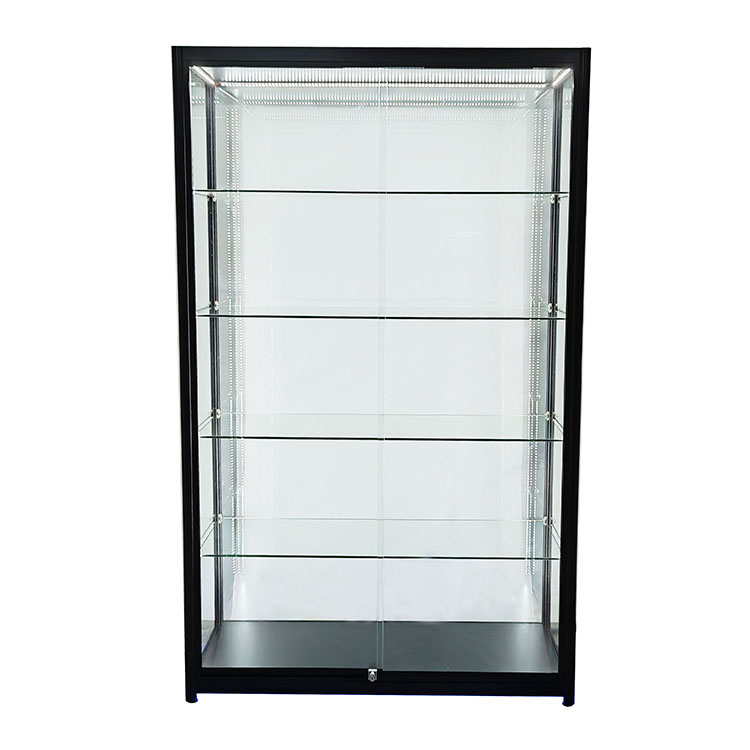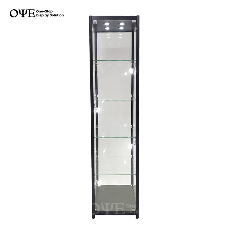 This Rectangular display showcases is one of our best glass display case on hot sale ! Image shows display case with a black frame. This pre-assembled rectangular display case features 4 LED top lights, four adjustable thick shelves,Plastic feet . locking hinged glass doors, electrical cord with switch, and ships fully/dis assembled for optional. The glass area of this display case is 77" high. The upright retail showcase comes in your choice of finish and frame. OYE Display is your one stop source for display cases, showcases, and retail store fixtures.