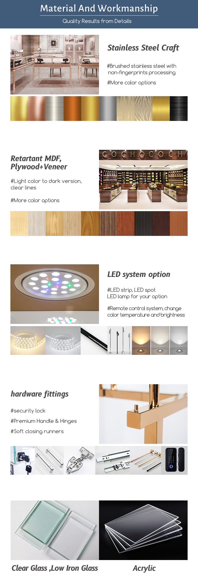 1)Ko te kounga teitei o te rauemi: MDF(te karaehe teitei), ko te karaehe ngawari, he kowiri tira pai, he maramara teitei o te Acrylic me te ULCE e arahina ana te rama rama etc.