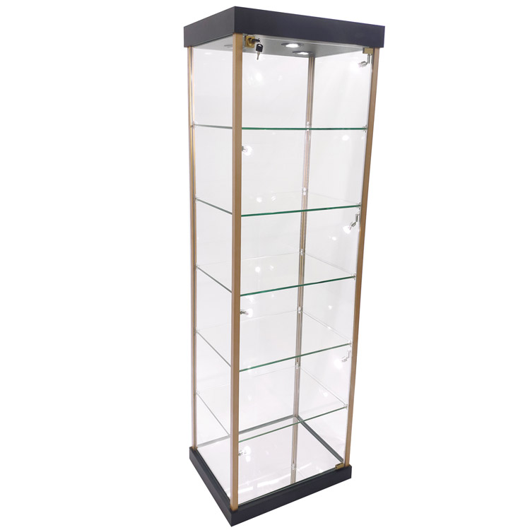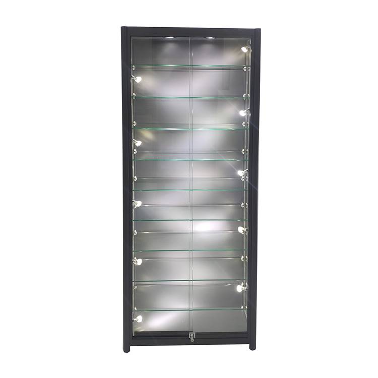 Use this black shot glass display case of curio as a trophy case for your professional accomplishments or to store and show off high-end merchandise in contemporary style. The adjustable shelves allow for fine tuning to find just the right height for your valuables. LED strips are set into the corners of this aluminum and glass curio display cabinet and illuminate the delicate details of anything stored within. A lock on the front helps to keep valuables safe, while still allowing quick access. The case arrives unassembled to help lower shipping costs. Pick up this curio display cabinet to showcase your personal collection or store merchandise today!