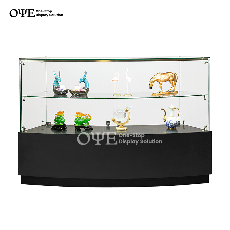 This curved glass cabinet has a big space to hold your products. And this glass cabinet is made from tempered glass-6mm and 3059C-0909C black laminate.And there are 2 drawers below the show case with big space.While this glass cabinet has 4 spot lights(warm white) to show your products clearly. We also provide customized samples.