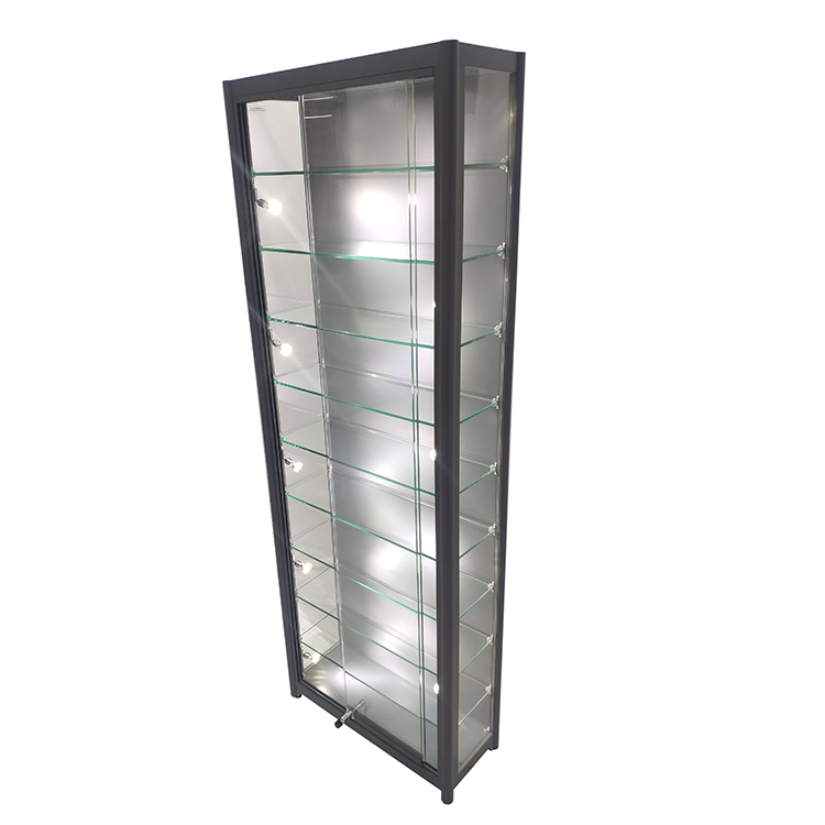 LED strips are set into the corners of this aluminum and glass curio display cabinet and illuminate the delicate details of anything stored within. A lock on the front helps to keep valuables safe, while still allowing quick access. The case arrives unassembled to help lower shipping costs. Pick up this curio display case with glass doors to showcase your personal collection or store merchandise today!