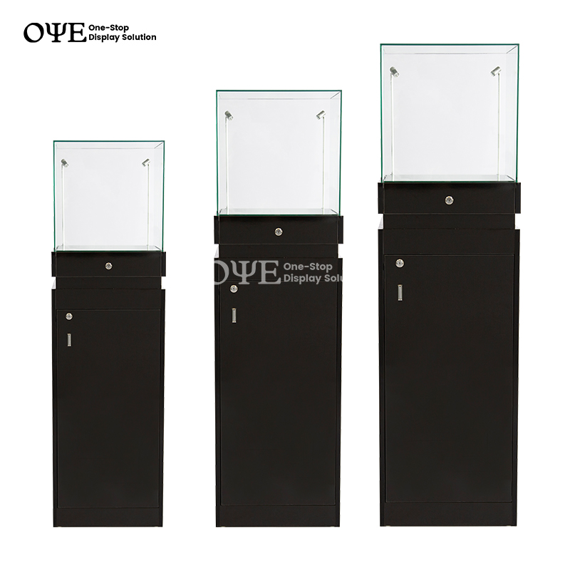 This pedestal display case features a simple locking design that isa perfect choice for museums, boutiques, or specialty retailers.Tempered & Polished Glass offer you a great view to show your exhibition,The matte black finish suits any decor. The low price point makes this display case a very affordable option for individual or bulk purchases. Top can be Assembled & Bottom for Knockdown.Hinged Door- Silver Stainless Steel/Alu to upon you choose, with Lock & Keys.The contemporary black pedestal is designed to complement any environment, while focusing attention on the contents.