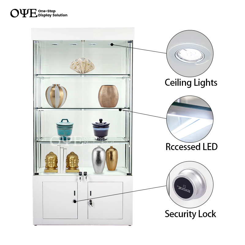 2.Free-standing display cabinets feature almost all-glass construction that allow customers to encircle the fixture while browsing. Thanks to their multi-level shelving, these cases can hold a lot more items than counter models, making them good choices for gift shops, antique stores, and other businesses that sell a lot of smalls.