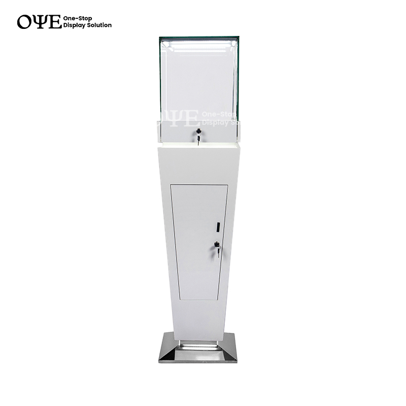 This tall jewelry Display showcases top tempered glass with gloss white painted finish,Storage with lockable hinged door. 4 LED strip lights with lens,Full vision glass offer a great view to show you luxury jewelry. Color and size support customized.This wholesale Tall jewelry Display showcases with storage will go perfectly with the contemporary design of your jewelry, boutique, gallery, welcome center to showcase the mementos you value most!Order now!